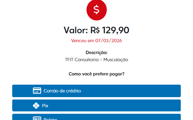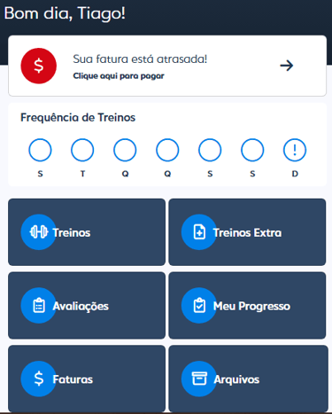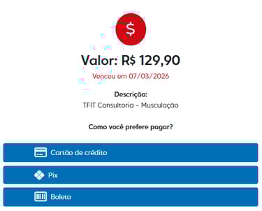 Como o sistema MFIT Personal está totalmente integrado à TFIT Consultoria, é também por meio dele que você receberá informações e orientações diretamente do seu professor. Além disso, o próprio aplicativo permite a gestão completa do seu plano, possibilitando o pagamento de faturas por PIX, boleto ou cartão de crédito, de forma simples e segura — tudo isso sem precisar sair do ambiente do seu treino.