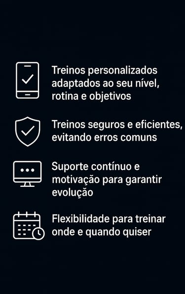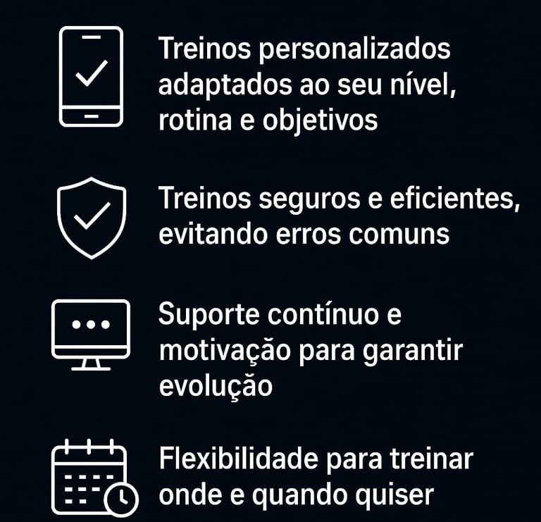 A consultoria é totalmente online: você recebe treinos personalizados no aplicativo, acompanha sua evolução e tem suporte contínuo direto com o personal trainer.